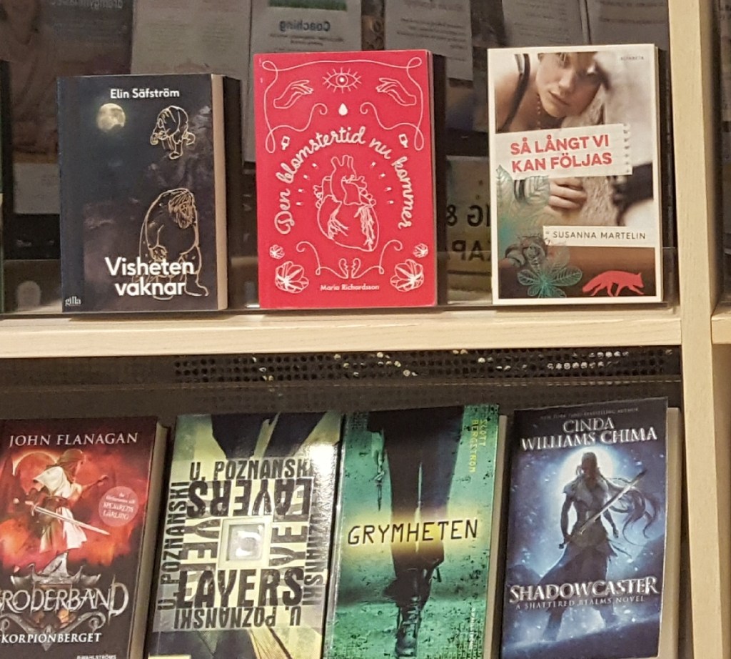 Jag (och andra) har åkt runt på olika bibliotek och olika bokhandlar för att fotografera min bok.