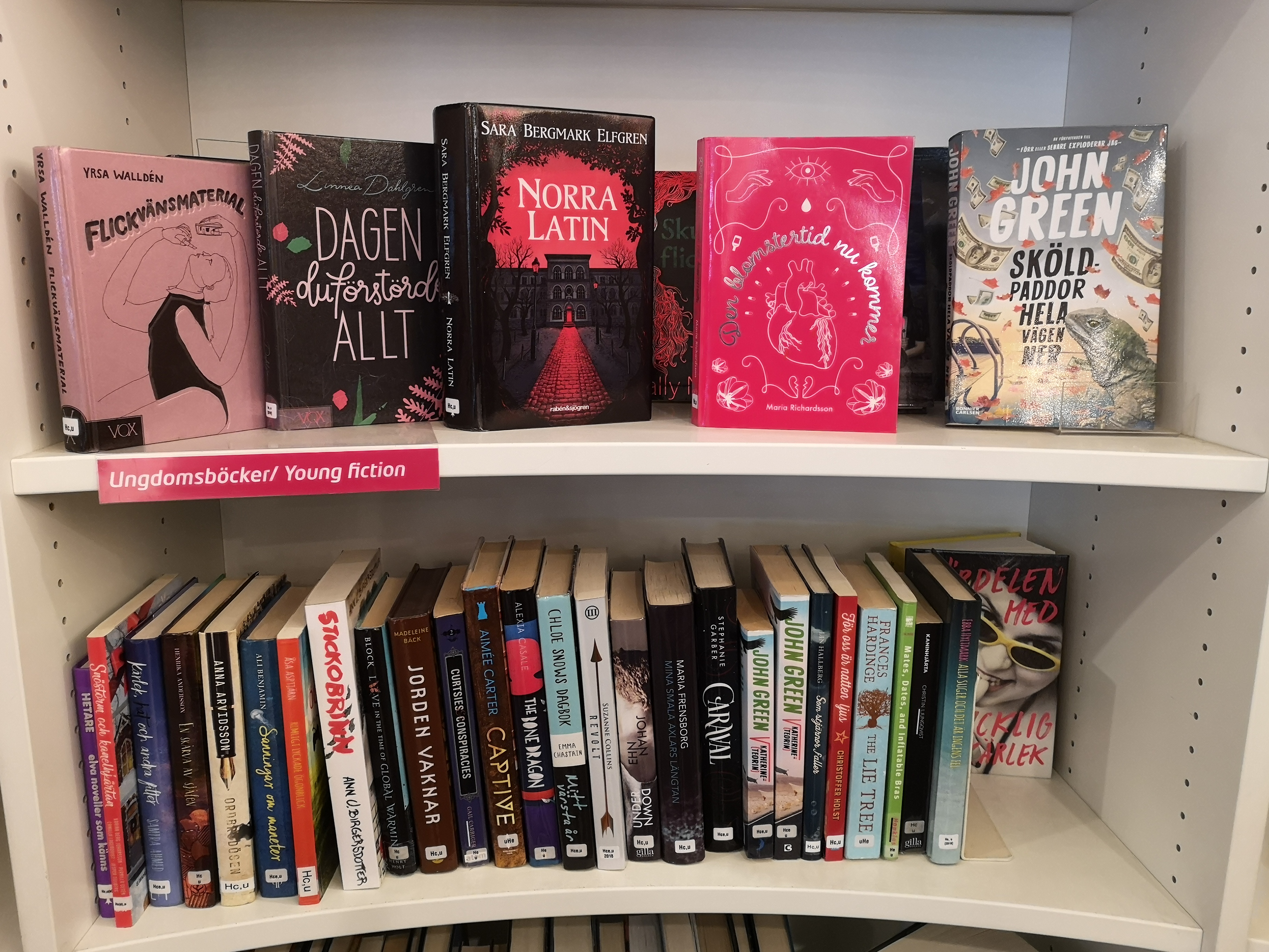 Nej, min man och jag har inte alltid samma åsikter om vad som är roligt att göra på en hotellweekend. Han var inte särskilt förtjust i mitt förslag att åka runt till alla bibliotek i Göteborg med omnejd och kolla upp ifall min bok fanns där. Det blev ett klart nej till det förslaget kan man säga. Däremot kunde han tänka sig att gå in på 300 m2, som är ett litet bibliotek som ligger vid Brunnsparken, eftersom vi ändå gick förbi där. 300 m2 beskrivs som ett stadsbibliotek i miniatyr, och det visade sig att Den blomstertid nu kommer fanns därinne, så här fint skyltad dessutom.