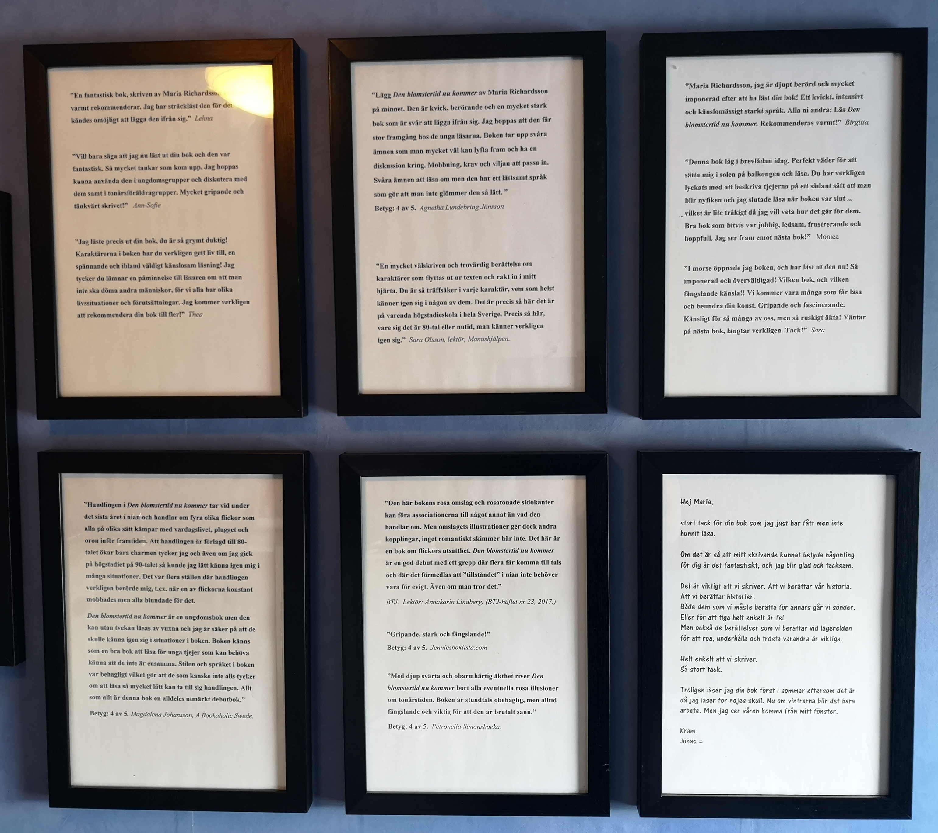 Jo, jag har ramat in fina recensioner, läsarkommentarer och ett brev som har stor betydelse för mig.