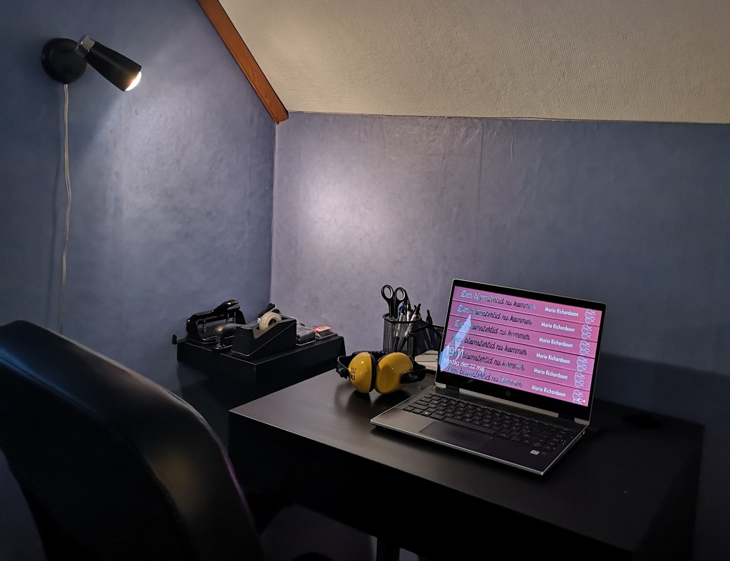 Lägg märke till de rejäla hörselskydden till vänster, de är viktiga ifall jag måste skriva när det är folk hemma.
