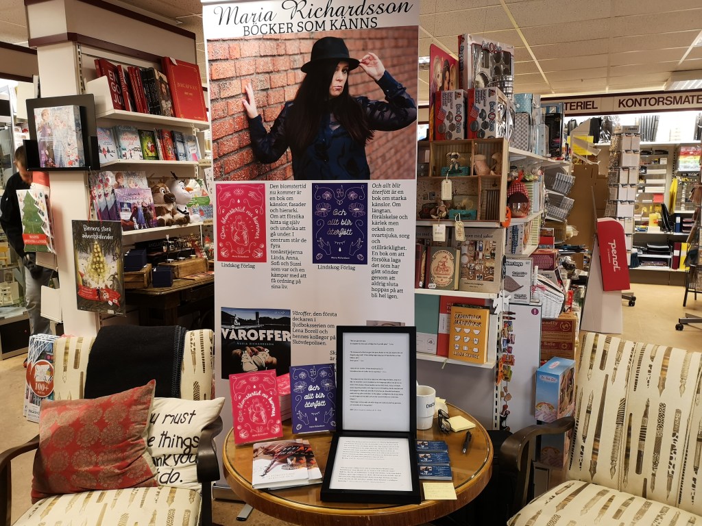 Jag satt i fotöljen till höger i bild och den som ville komma och prata kunde sitta till vänster. Det blev en del signerade, och en hel del samtal. Om handlingen i mina böcker, om min kommande ljudbok, om författarskapet och om skrivkursen som förhoppningsvis kommer igång i Karlsborg längre fram.