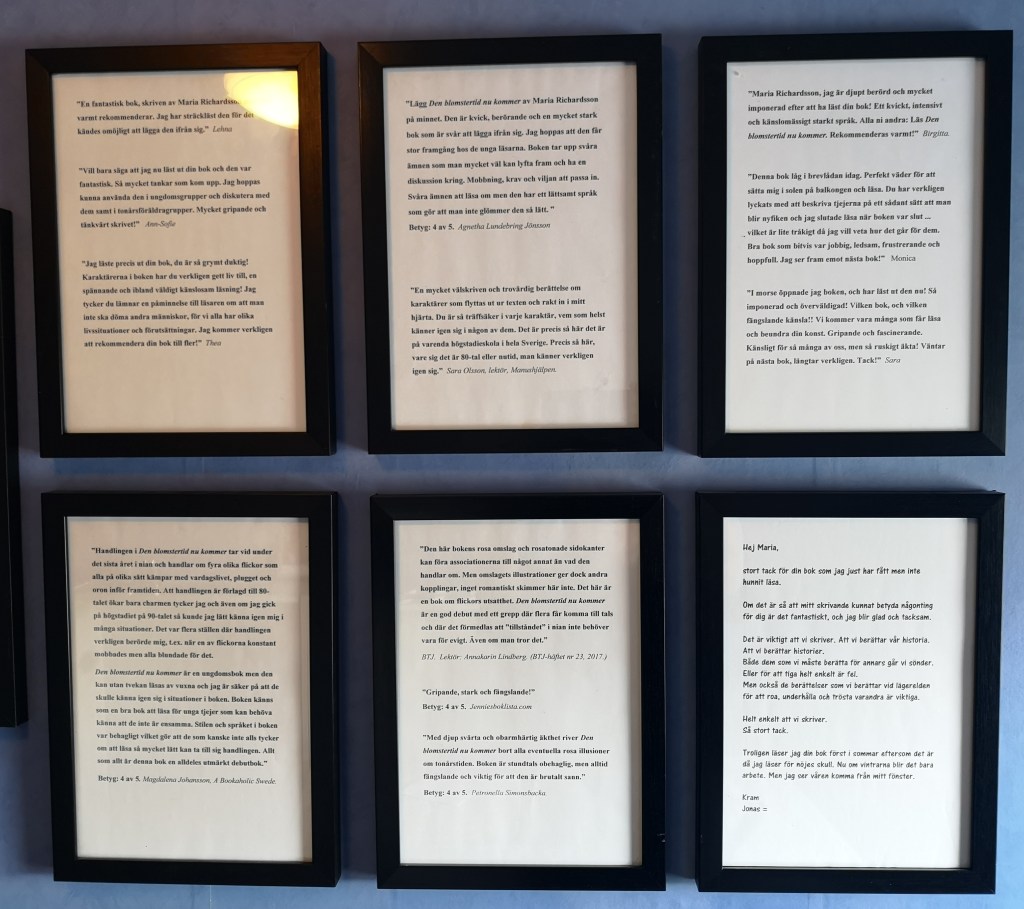 Däremot är den väldigt ouppdaterad, det sitter bara recensioner från min första bok Den blomstertid nu kommer uppe. Sedan jag ramade in dessa recensioner har det ju förstås hänt massor, eftersom jag släppt två böcker till. Och självklart vill jag ha upp recensioner från alla mina tre böcker, och gärna några fina mail jag fått skickat till mig också, för sådana mail finns.