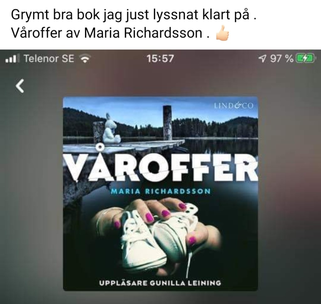 2. Jag var och klippte mig hos en ny frisör idag. Frisören frågar vad jag jobbar med. Jag svarar författare och hon undrar vad jag har skrivit för böcker. När jag berättar det visar det sig att hon har lyssnat på Våroffer och tyckte den var jättebra! 🤩