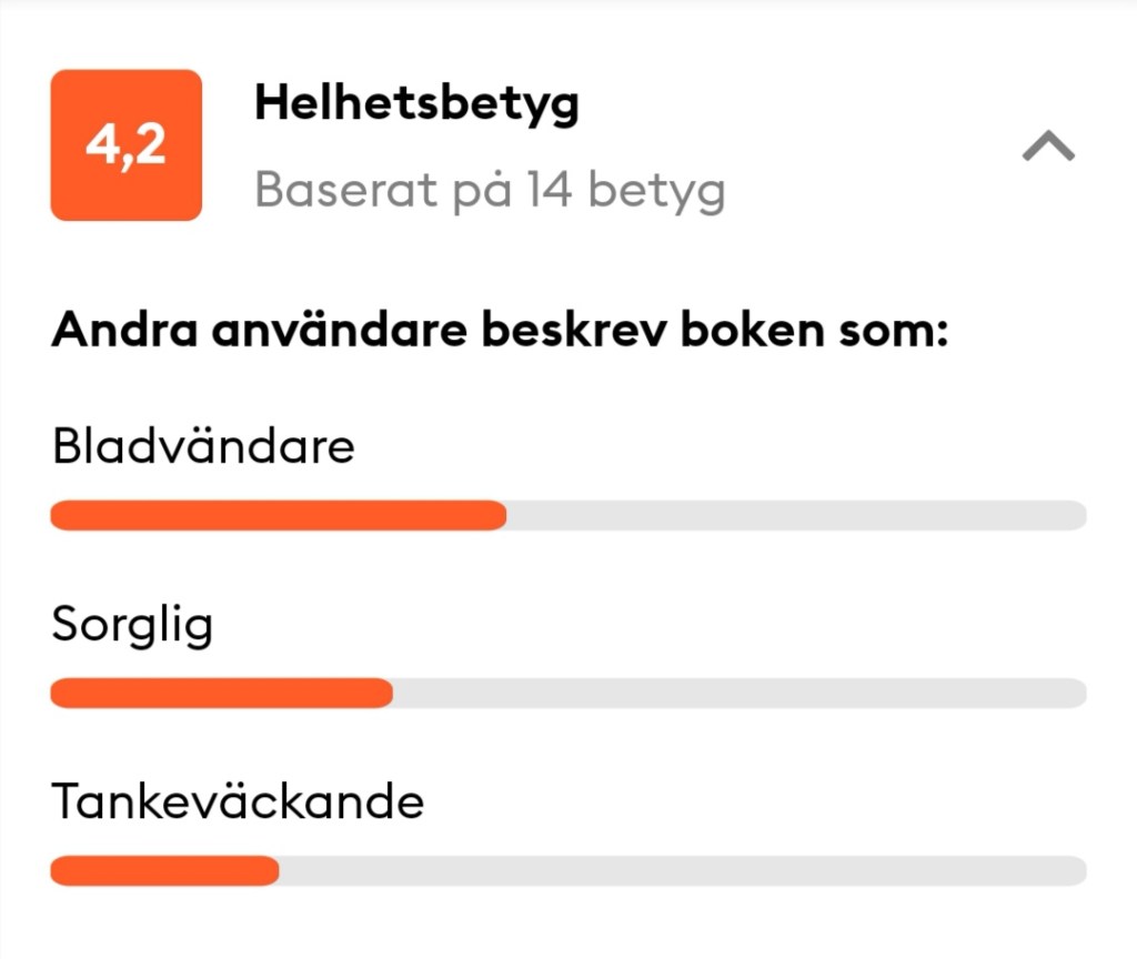 Nu sex dagar senare har den 14 betygsättningar på Storytel och ett snittbetyg på 4,2!!!!!!!!