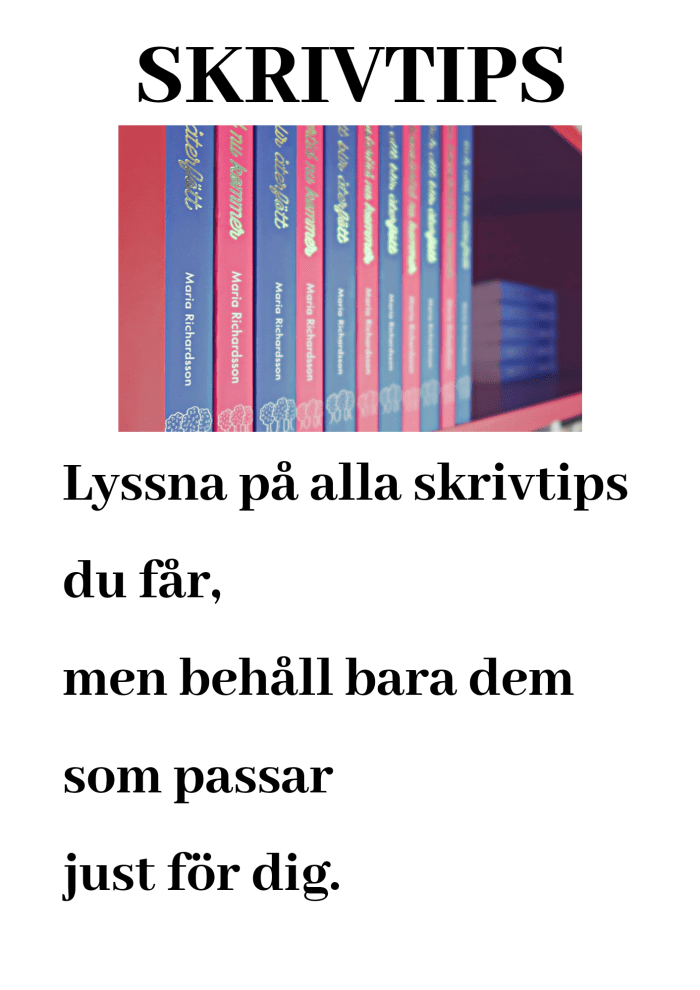 Även om du vill så kan du omöjligt följa alla skrivtips du får, och många av skrivtipsen motsäger dessutom varandra. Därför är det oerhört viktigt att du lär dig sålla bland skrivtipsen.