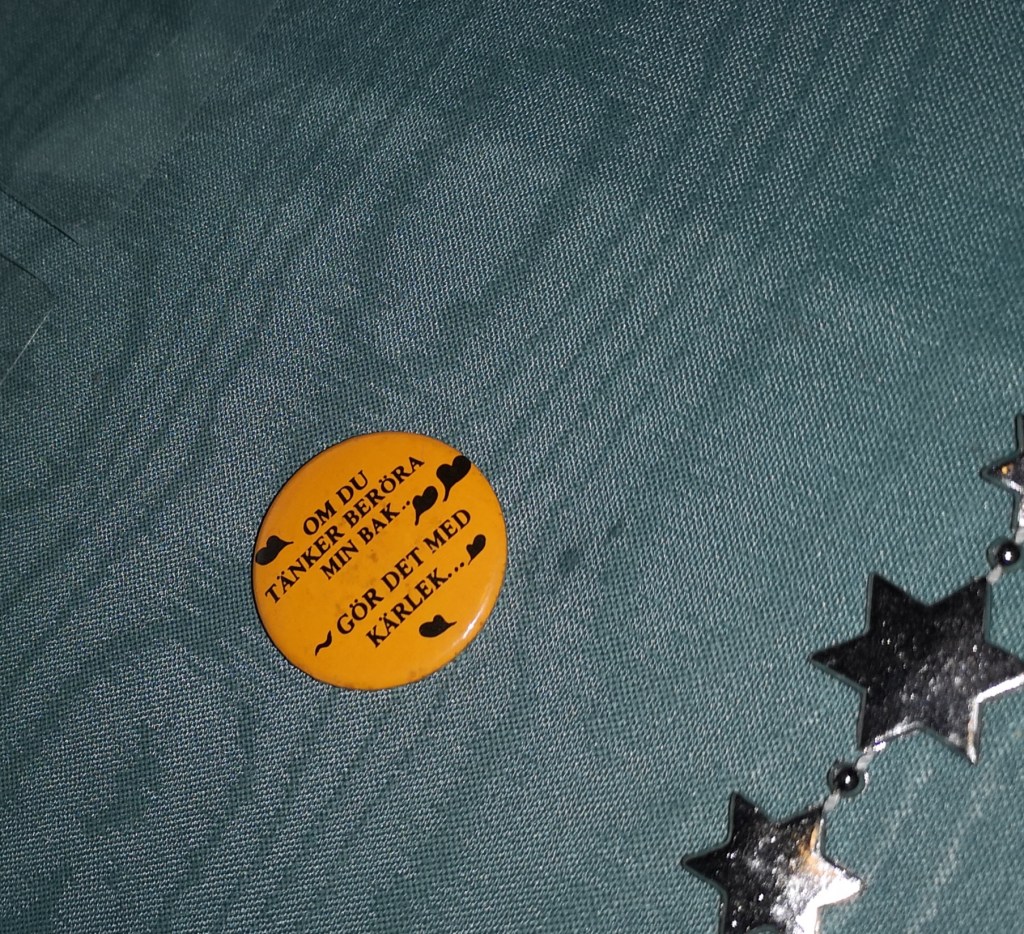 Jag hade också en knapp (tro det eller ej) som var fäst på baken där det stod Om du tänker beröra min bak, gör det med kärlek.