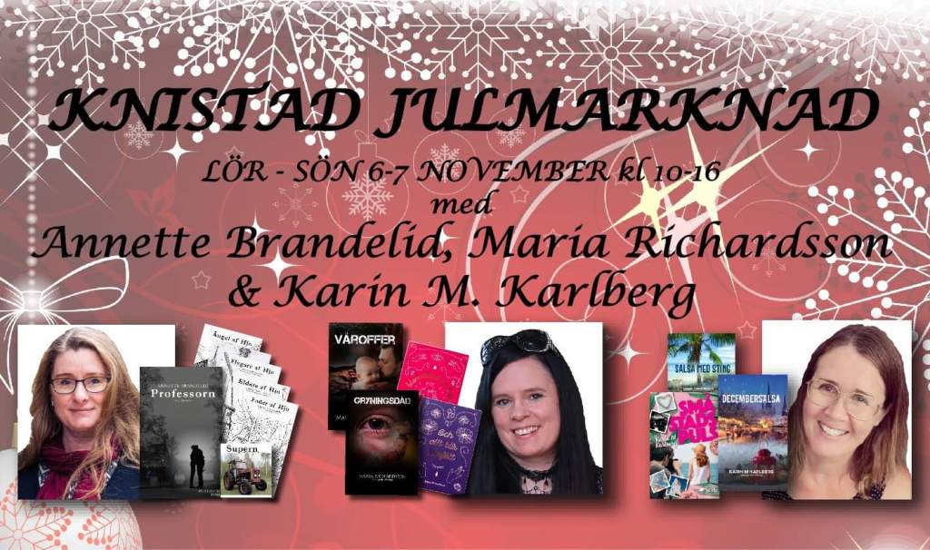 På Knistad julmarknad kommer det att finnas många olika utställare med ett stort utbud av godsaker, julpynt och presenter. Julmarknaden är helt och hållet utomhus i år, och i ett tält kommer du att hitta mig och två av mina författarkollegor och våra böcker.