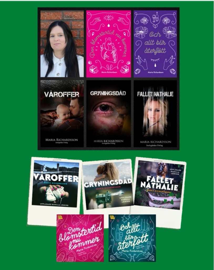 Här en bild på mig och mina böcker, överst pappersböckernas omslag och längre ner ljudböckernas omslag.