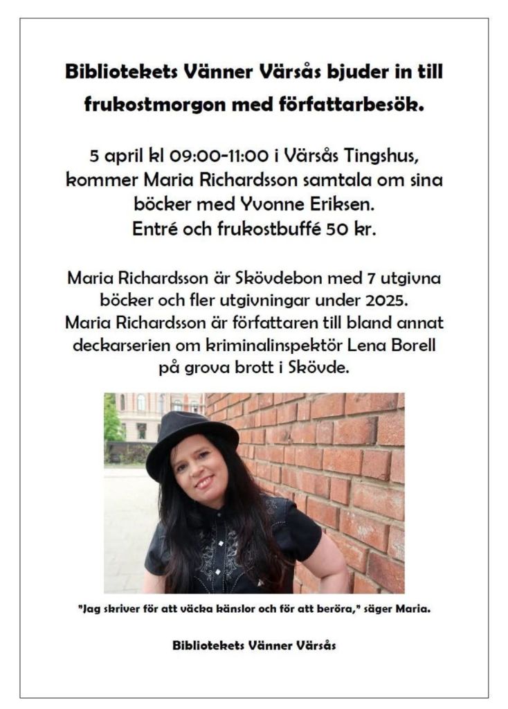 Jag blev inbjuden av Bibliotekets Vänner i Värsås att komma och berätta om mitt författarskap den 5 april. Värsås är en liten ort utanför Skövde, belägen bara några kilometer från Igelstorp där jag bor.